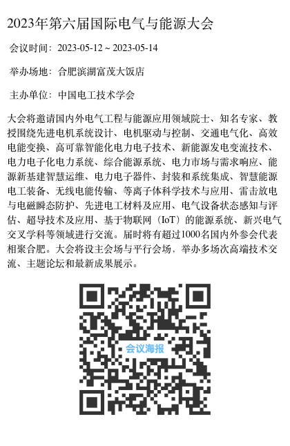 在国家能源结构调整相关政策及规划引导下,为提升我国电气与能源工程装备制造水平,直面国家实现碳达峰、碳中和的重大战略需求,凝练全球智慧能源与低碳电气装备的科学问题和发展方向,加强国内外电气与能源工程专家和学者之间的交流,经中国科协批准,由中国电工技术学会、合肥工业大学、电气电子工程师学会(IEEE)北京分会主办的2023 IEEE第六届国际电气与能源大会(2023 IEEE 6thInternational Electrical and Energy Conference,CIEEC 2023)将于2023年5月12-14日在安徽省合肥市召开。