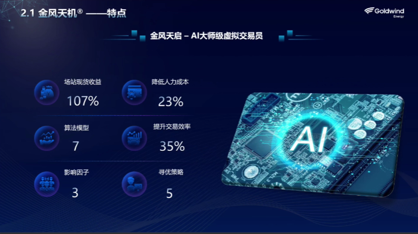 同时,金风科技天机云平台还自主研发出了AI虚拟交易员,在自有电站得到充分应用,交易效率提升35%,人力成本节约23%,场站综合收益提升了7%。