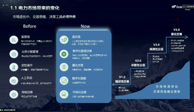 李海波认为,早期的电力市场重营销、业务管理分散,主要体现在定性操作、交易思维传统和统计工作手动化等方面,效率相对低下,效益不明显。而推进全国统一电 力交易市场的今天,电力市场已经变成了重交易、决策管理集中化和交易环节定量化,需要借助数字化的能力,赋能交易和市场化运维。