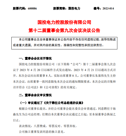 品牌活动 国投电力总经理换人 2023-04-23 10:25:37 分享 4月21日,国投电力召开董事会,审议通过了《关于聘任公司总经理的议案》。根据公司董事长提名,并经公司董事会提名委员会审查通过,同意聘任于海淼先生为公司总经理,任期自本次董事会决议通过之日起,至本届董事会换届之日止。于海淼,历任天津国投津能发电有限公司工程技术部主任、副总工程师、总工程师、副总经理,国投云顶湄洲湾电力有限公司总经理,国投电力控股股份有限公司副总经理。