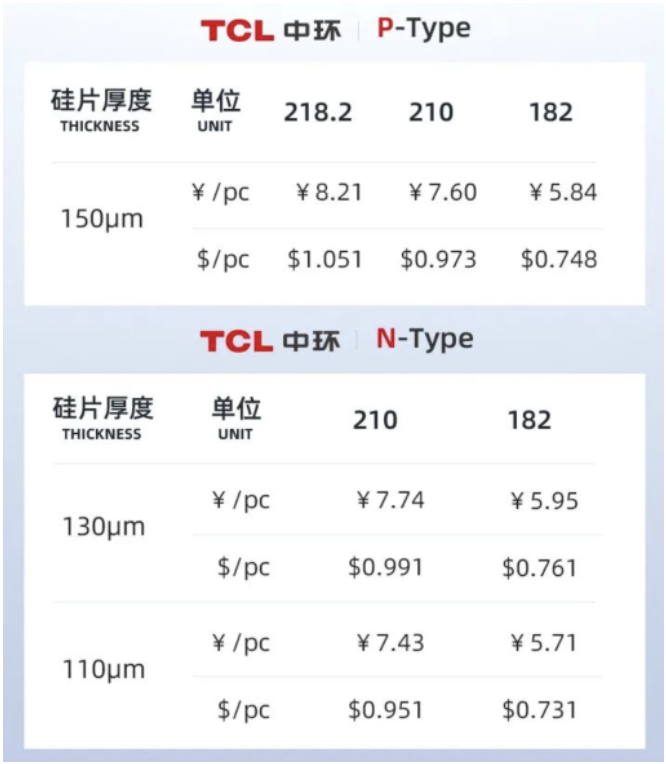 N型产品中,130μm的210、182分别为7.74元、5.95元,相较4月6日8.20元、6.52元,分别下降5.61%、8.74%。