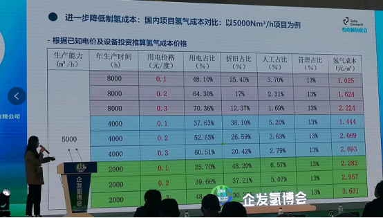 随着制氢规模的扩大,也有助于氢气成本的降低。她以5000Nm3/h项目为例,当年生产时间为2000小时,用电价格0.3元/度时,氢气成本达到 3.631元/m3,但是当年生产时间达到8000小时时,氢气成本将降低到2.224元/m3。随着风光清洁电能的度电价格下降,当降低到0.1元/度 时,氢气成本将能够降低至1.025元/m3。随着成本的降低也将持续推升氢气产能的扩大。