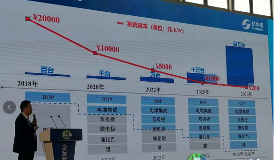 随着产能和销量的增长,氢燃料电池系统成本正在快速下降当中,据预测,当2030年,全国产能达到百万台的时候,系统成本将下降至200元/kW,这与2018年百台级的20000元/kW相比,只有百分之一。