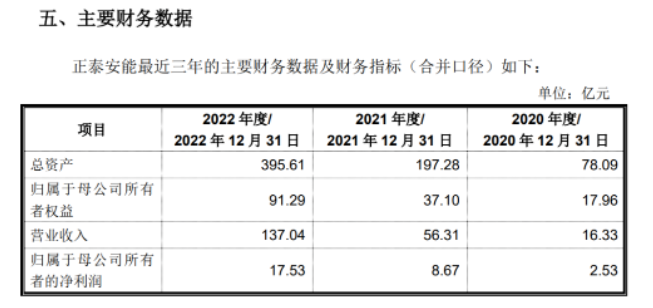 2020 年度、2021 年度、2022 年度,正泰安能归属于母公司所有者的净利润为17.53亿,2020年和2021年分别为2.53亿和8.67亿。该公司营收在2020年到2022年为16.33亿、56.31亿和137.04亿元,涨幅巨快。