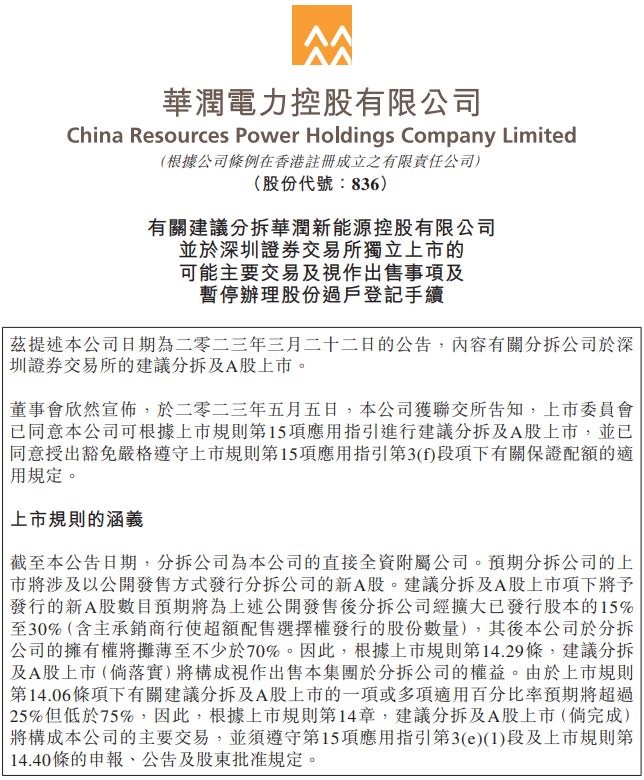 6月18日,华润电力发布《有关建议分拆华润新能源控股有限公司并于深圳证券交易所独立上市的可能主要交易及视作出售事项及暂停办理股份过户登记手续》。
