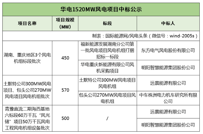 国际能源网/风电头条(微信号:wind-2005s)获悉,7月2日,华电集团电子商务平台接连发布《中国华电集团有限公司相关项目工程湖南、重 庆地区3个风电机组标段批次中标结果公示》、《华电内蒙古能源有限公司相关招标项目工程土默特公司300MW风电项目、包头公司270MW风电项目风电机 组批次中标结果公示》、《中国华电集团有限公司青海分公司项目工程青豫直流二期海西基地华电 (海西)新能源有限公司六标段60万千瓦“风光储”项目50万千瓦风电工程风电机组设备批次中标结果公示》的公告。东方风电、明阳智能、远景能源、中车株 洲所四家企业中标。