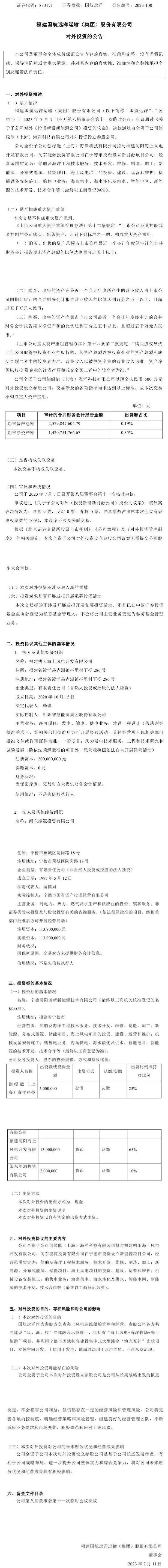 7月11日,国航远洋发布对外投资的 公告,公司全资子公司创绿能(上海)海洋科技有限公司拟与福建明阳海上风电开发有限公司、闽东能源投资有限公司在宁德市投资设立新能源项目公司,经营范围 暂定为:船舶及海洋工程技术服务、技术开发、维修、制造、加工;新能源、分布式能源、储能项目、海上风电项目的投资、建设、运营和维护等。创绿能(上海) 海洋科技有限公司拟出资500万元,持股25%。