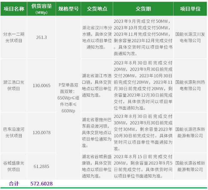 根 据招标公告,湖北公司国能长源汉川发电有限公司分水一二期等4个光伏项目光伏组件设备集中采购公开招标项目为分水一二期光伏项目、潜江浩口光伏项目、巴东 沿渡河光伏项目和谷城盛康光伏项目所需的光伏组件设备采购,主要实施地点为湖北省孝感市、荆州市、恩施州、襄阳市,具体施工地点以项目单位实际项目地点为 准。本次主要采购650Wp≤组件功率≤660Wp,P型单晶硅双面双玻光伏组件及附属设备,采购总容量不小于572.6028MWp。