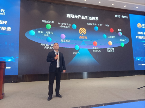 以“全鑫上阵”为主题,孙海鹏先生分享了协鑫鑫阳光户用光伏产品生态与解决方案。从全(能源全业态)、鑫(协鑫集团)、上(箭在弦上)、阵(布阵全国)四个方面做介绍。