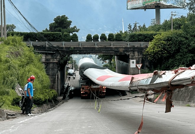 面对转弯半径严重不足、“卡脖子”桥洞两道坎,运输团队积极与地方政府沟通,提前将“90度分道”拓建为弧形弯道,解决运输车转弯半径不够的难题。同时,提 前进行实地勘测,精确测算过桥洞时叶根、叶尖与桥洞的距离,进一步调整运输工装的高度及叶片运输姿态,从而保障了B973A型叶片顺利通过桥洞。