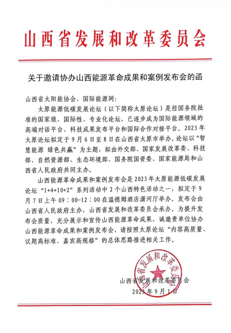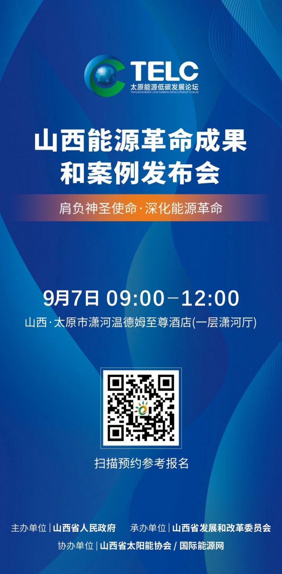 此次论坛期间,由山西省人民政府主办,山西省发展改革委承办,山西省太阳能协会、国际能源网协办的“山西能源革命成果和案例发布会”,将于2023年9月7日正式举办,现开放预约报名通道。