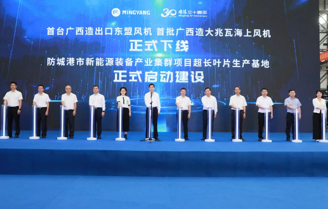 9月9日,明阳首批“广西造”大兆瓦海上风机下线仪式、防城港市新能源装备产业集群超长叶片生产基地启动仪式在广西省防城港市举行。广西壮族自治区政协副主席钱学明、防城港市委书记谭丕创、防城港市长黄江、明阳集团党委书记、董事长张传卫出席活动。