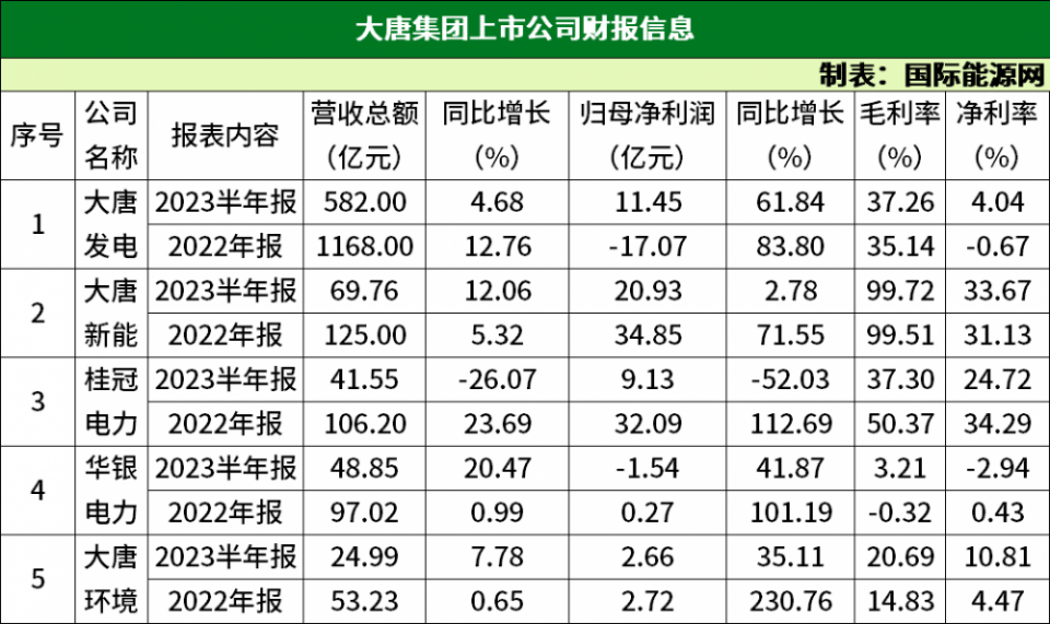这一任务被分解在中国大唐旗下的上市公司和其他非上市公司中。大唐旗下一共有5家上市企业,大唐发电、大唐新能源、大唐环境为港股,桂冠电力和华银电力为A股上市企业。国际能源网对其今年半年报进行了汇总,并引入2022年报进行对比分析。