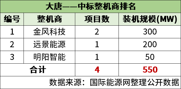 大唐开标规模为550MW,占总开标规模3.01%,由金风科技、远景能源、明阳智能3家整机商中标。