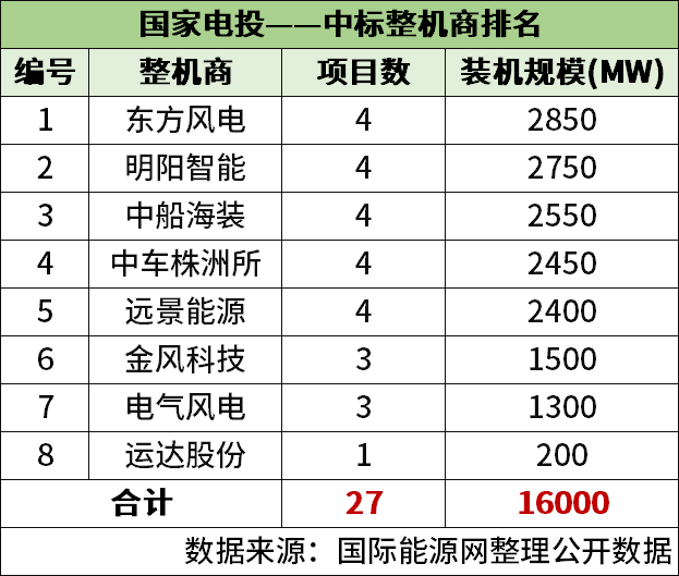 国家电投开标规模为16000MW,占总开标规模87.53%,由东方风电、明阳智能、中船海装、中车株洲所、远景能源、金风科技、电气风电、运达股份8家整机商中标。