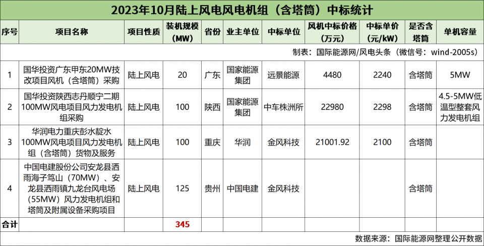 根据国际能源网/风电头条(微信号:wind-2005s)风电项目数据库统计显示,10月份,含塔筒的陆上风电项目总计4个,规模为345MW,项目中标均价为2213元/kW。