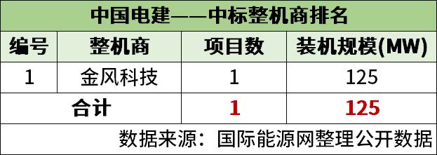 中国电建开标规模为125MW,占总开标规模0.68%,由金风科技1家整机商中标。
