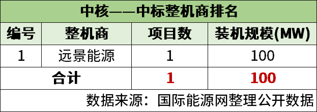 中核开标规模为100MW,占总开标规模0.55%,由远景能源1家整机商中标。