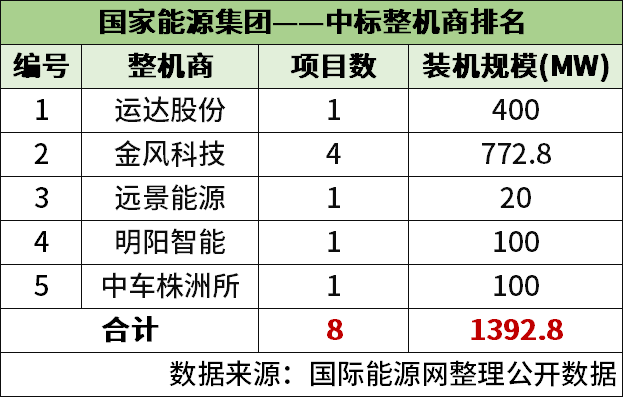 国家能源集团开标规模为1392.8MW,占总开标规模7.62%,由运达股份、金风科技、远景能源、明阳智能、中车株洲所5家整机商中标。