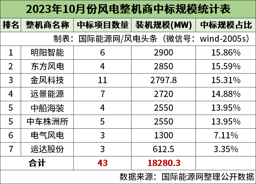 根据国际能源网/风电头条(微信号:wind-2005s)风电项目数据库统计显示,2023年10月份风电中标项目累计18280.3MW(约18.28GW),共有8家整机商中标。
