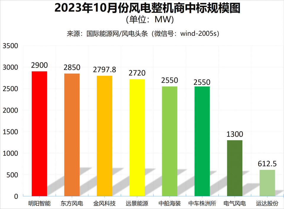 根据国际能源网/风电头条(微信号:wind-2005s)梳理,2023年10月份共有7家央企开发商发布风电机组开标结果,分别是国家电投、国家能源集团、大唐、中国电建、华润、中核、中国能建 。