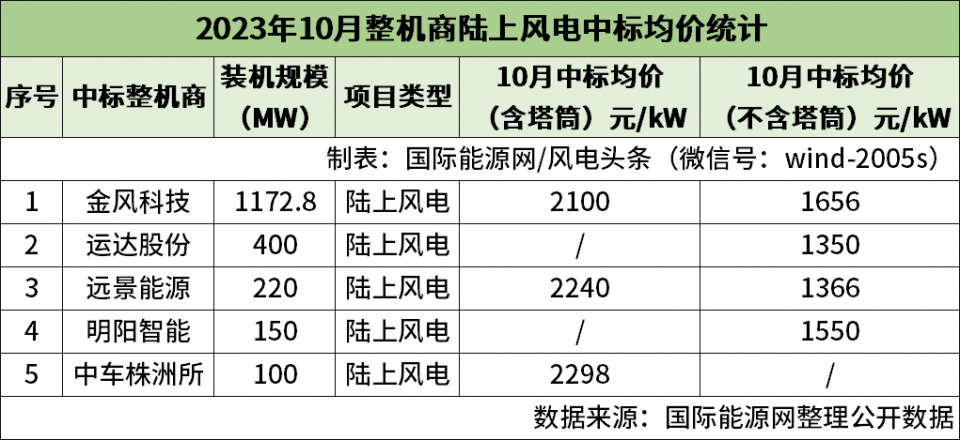 根据国际能源网/风电头条(微信号:wind-2005s)风电项目数据库统计显示,从10月份风电整机商中标均价来看,在陆上风电项目各整机商中,含塔筒最高中标均价为中车株洲所2298元/kW,不含塔筒最高中标均价为金风科技1656元/kW。