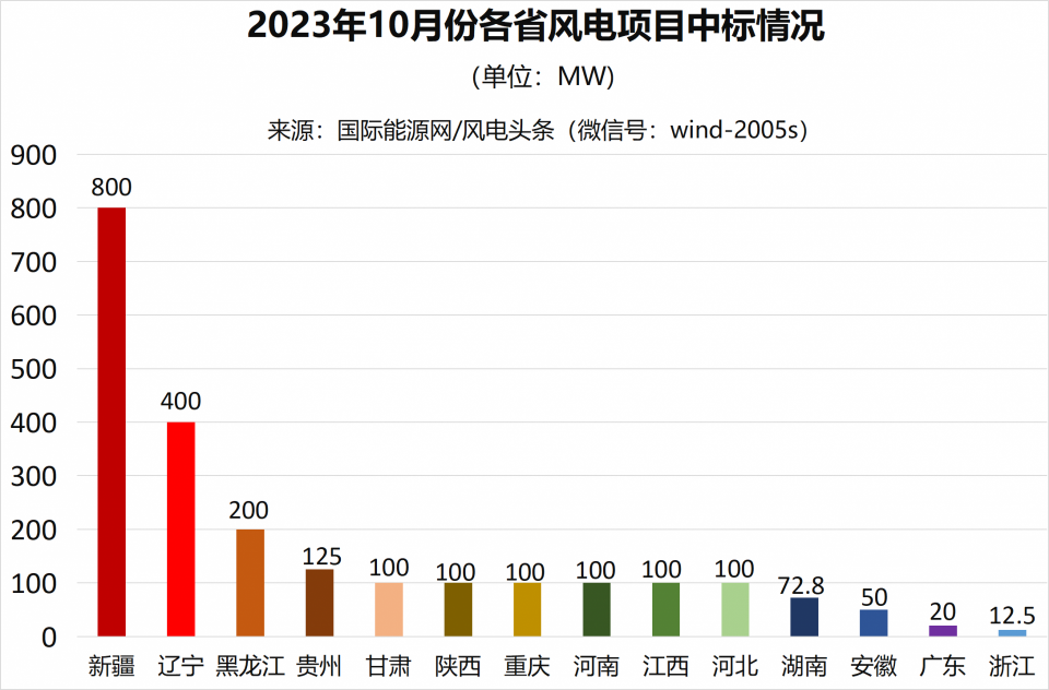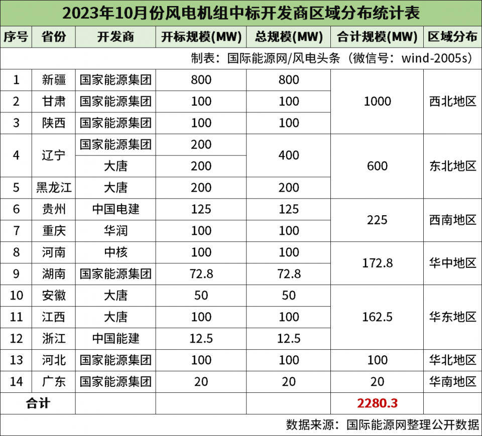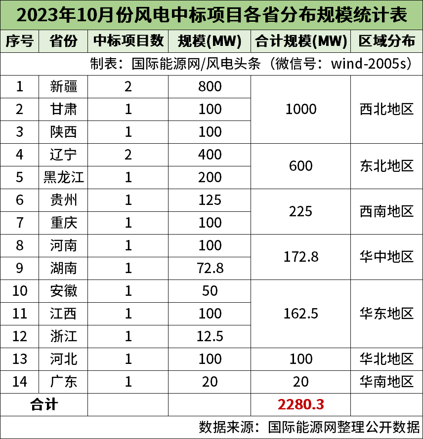 根据国际能源网/风电头条(微信号:wind-2005s)风电项目数据库统计,2023年10月份有14个省份风电项目进行开标,规模总计2280.3MW。(备注:国家电投海上风电框架集采未计入内 )