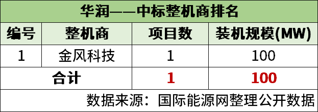 华润开标规模为100MW,占总开标规模0.55%,由金风科技1家整机商中标。