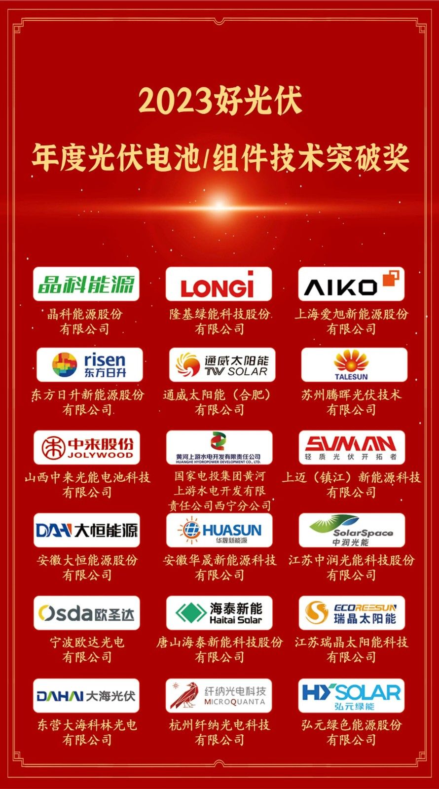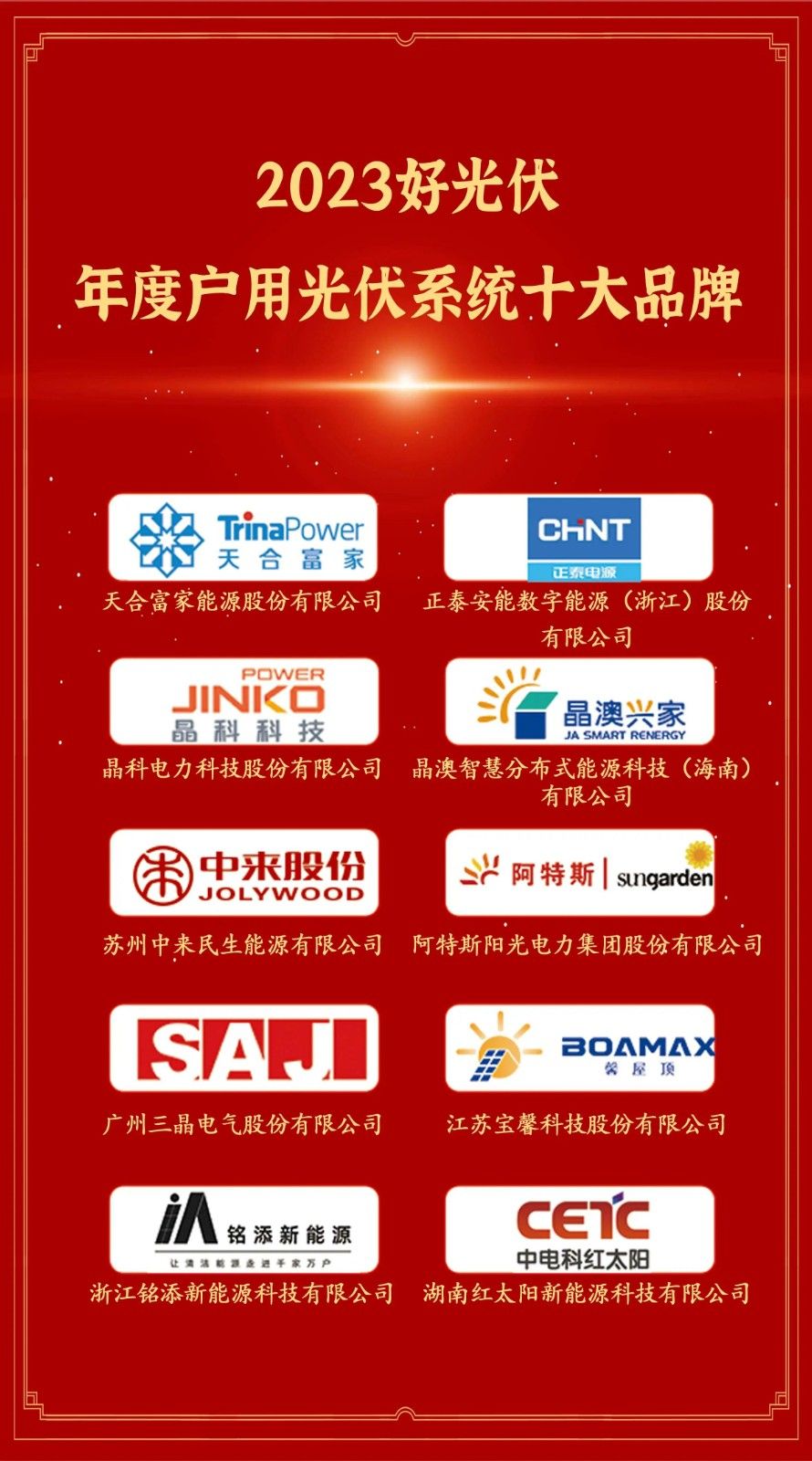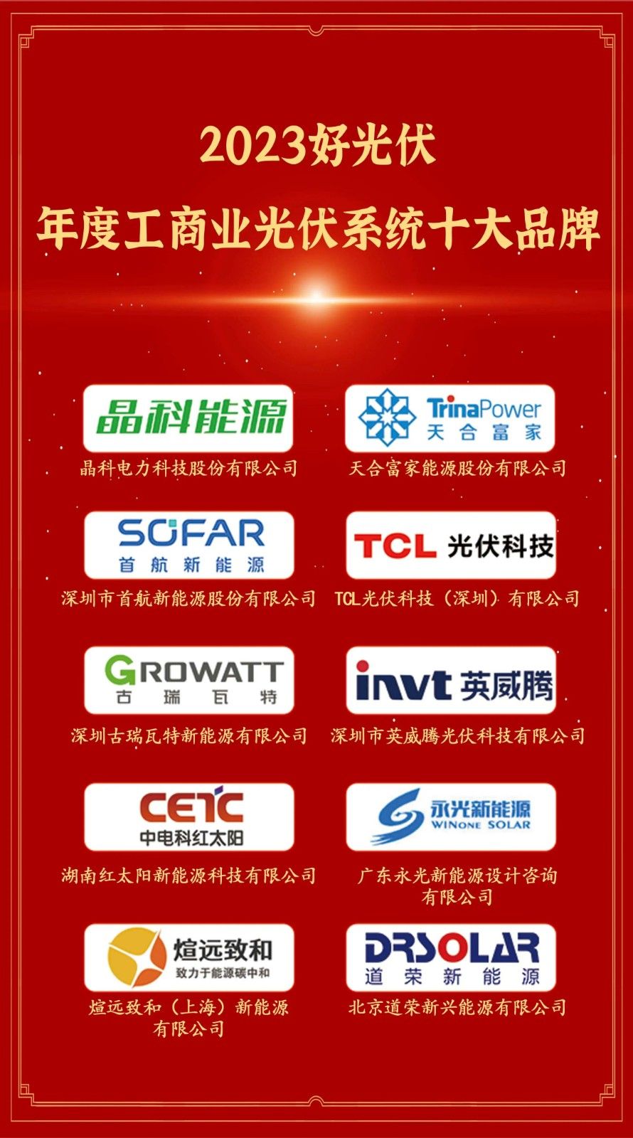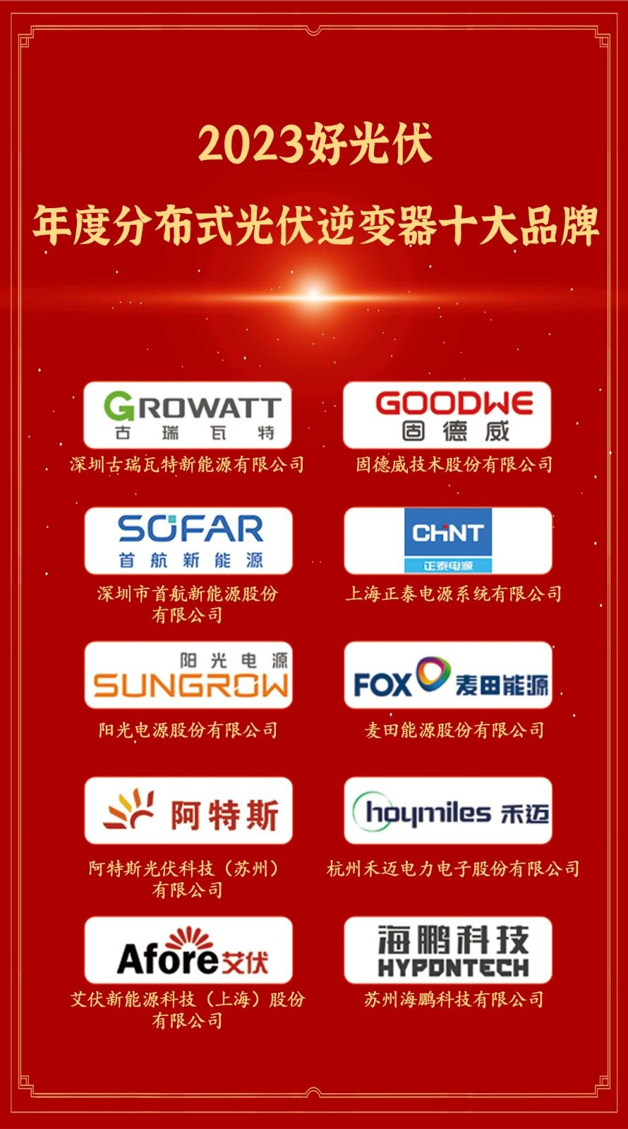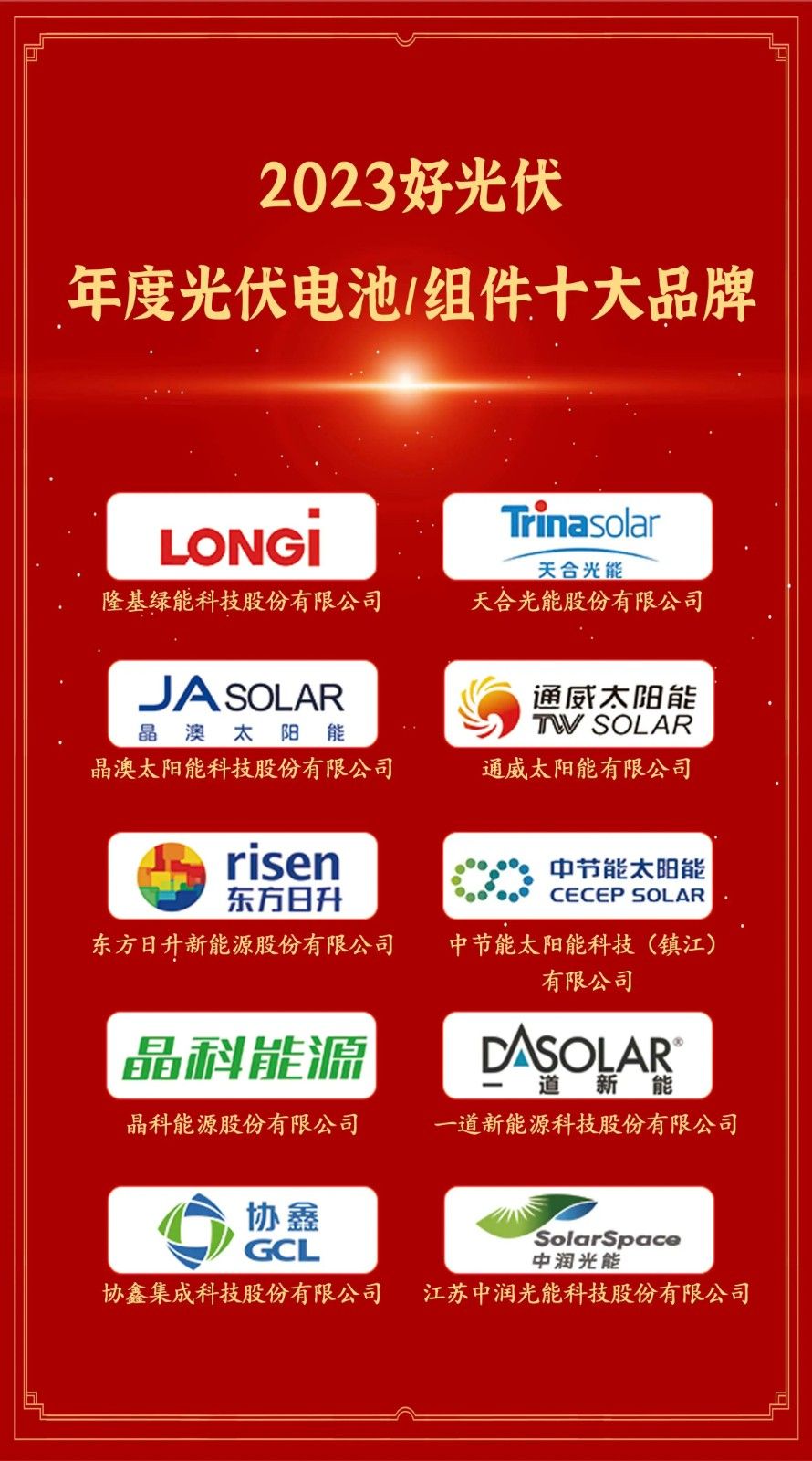 品牌活动 2023第八届好光伏品牌榜单发布! 2023-11-08 13:20:09 分享 11月7日,2023第八届好光伏品牌颁奖盛典在山东省临沂市隆重举行。该年度品牌活动由能源行业权威媒体国际能源网全媒体平台于2016年正式发起,旨在鼓励太阳能光伏企业的技术创新和品牌建设,表彰优秀企业为产业持续发展做出的重要贡献,现已成为光伏行业最具影响力的品牌奖榜。奖项设置包括年度行业绿色能源企业家、年度光伏领袖企业、年度光伏十大品牌官&优秀CSO、年度全球光伏优秀品牌、年度光伏电池/组件十大品牌、年度光伏逆变器十大品牌等。2023第八届好光伏品牌奖项已揭晓,榜单如下: