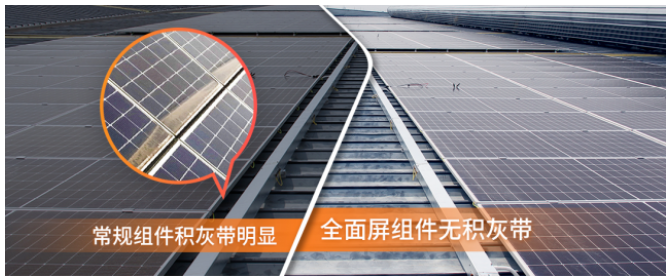 在粉尘较多且安装倾角较小的工商业分布式应用场景之中,全面屏组件发挥了免清洗,多发电的优势,为光伏电站带来更高的发电增益。