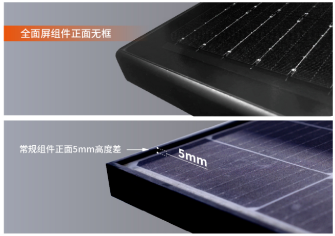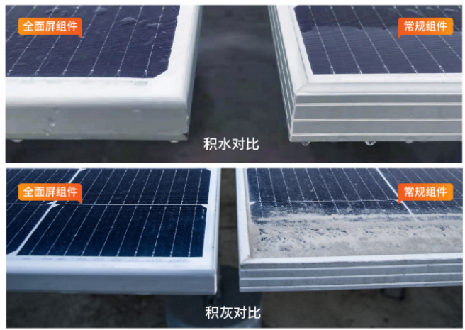 大恒能源经过长期研究发现,积灰形成的主要原因在于,常规组件的边框高于玻璃面3—5毫米,这导致雨水冲刷灰尘时形成阻隔,从而造成积灰,而且随着时间的累积,积灰越发严重。而大恒能源的全面屏组件,采用正面无边框设计,不论是长边还是短边均与玻璃面齐平,不管横装、竖装,都可以有效解决组件积水、积灰问题。