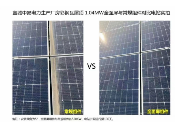 2022年10月,位于安徽省宣城市郎溪经济开发区的安徽省中易电力园区建设的1.04MW全面屏组件光伏电站顺利并网运行。该电站分别选装了同版型、同功率、同块数的全面屏组件与常规组件,并且采用同型号逆变器。10月当月电站监测数据显示,全面屏组件相对常规组件发电增益达8.2%。