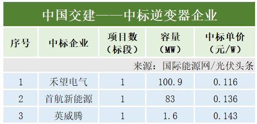 中国交建本统计周期有3个项目定标,合计定标容量185.5MW。禾望电气成为最大赢家,中标100.9MW。此外,首航新能源、英威腾也赢得了中国交建的逆变器采购项目。