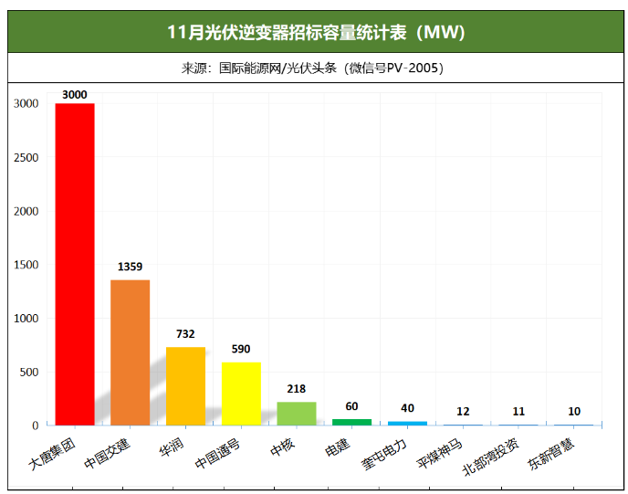 国际能源网/光伏头条(PV-2005)统计,进入11月之后,大唐集团、中国交建、华润、中国通号、中核、电建等央企以及奎屯电力、平煤神马、北部湾投资、东新智慧等15家企业发布了28个逆变器采购项目,合计容量约6.04GW。