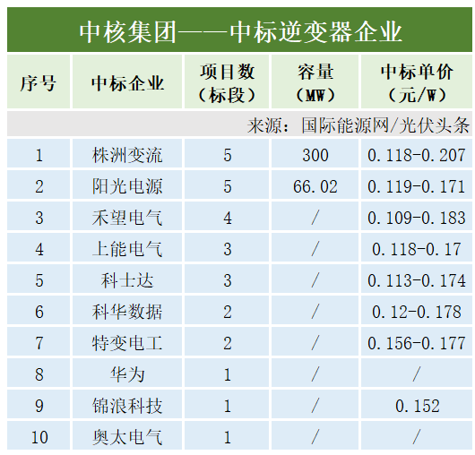本统计周期,中核电建有49个项目定标,确定定标容量2548.05MW。阳光电源成为其中赢家,中标11个项目(标段),确定中标容量为500MW。此外,上能电气、株洲变流、锦浪科技、华为、禾望电气、特变电工等21家逆变器制造商以及代理商均有斩获。
