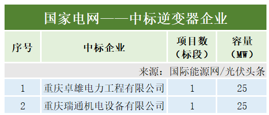 国家电网本统计周期有2个项目定标,重庆卓雄电力工程有限公司与重庆瑞通机电设备有限公司分别中标25MW。