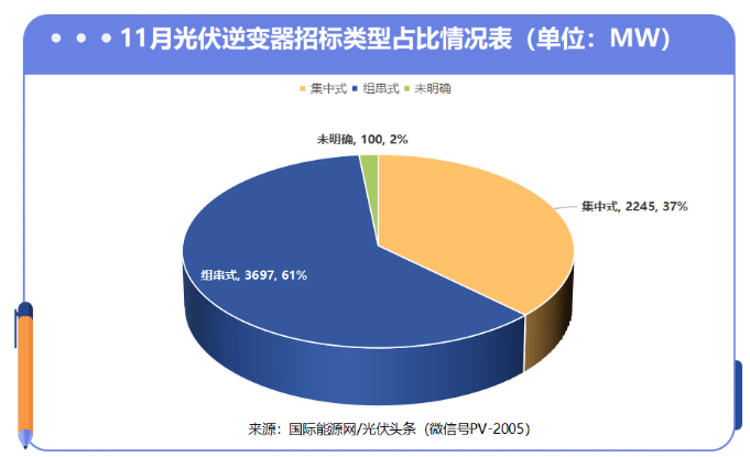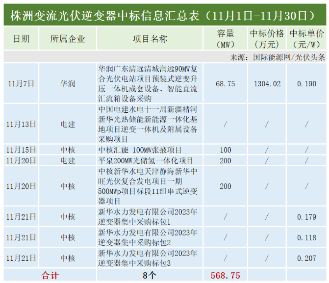 国际能源网/光伏头条(PV-2005)根据公开信息不完全统计,11月1日-11月30日,约有87个逆变器招标项目(标段)定标,合计容量17.81GW。中标企业方面,华为、阳光、株洲变流、特变、上能、锦浪、禾望、古瑞瓦特等企业中标。