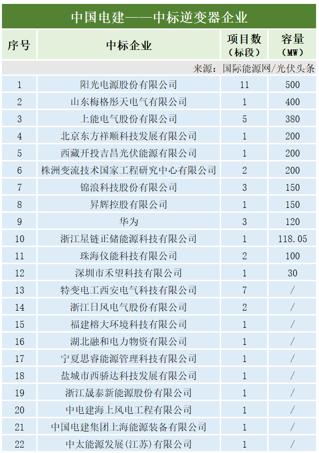 本统计周期,阳光电源排名企业中标榜第二名,中标中核、电建、中铁集团、华电、国家能源集团等企业22项目(标段),合计中标容量1528.5MW。