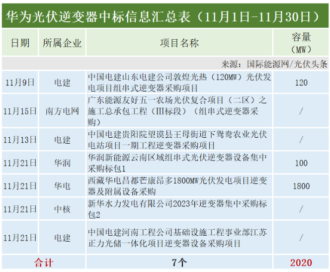 本统计周期,华为位列中标榜第一名,中标电建、南方电网、华润、华电、中核等企业7个项目(标段),确定中标容量2020MW。