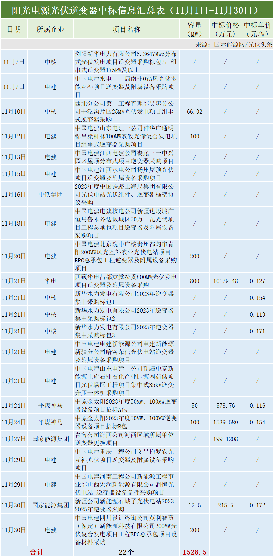 据国际能源网/光伏头条(PV-2005)统计,11月阳光电源最高价中标项目为国家能源集团新疆公司新能源石城子光伏电站2023-2025年逆变器采购。该项目为技改项目,招标范围包括25台500kW逆变器的供货(含安装)升级改造。阳光电源作为第一中标候选人,投标报价215.5万元,折合单价0.172元/W。
