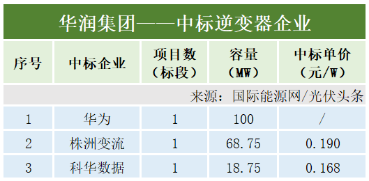 华润集团本统计周期有3个逆变器采购项目定标。华为、株洲变流、科华数据等三家企业中标,详情如下: