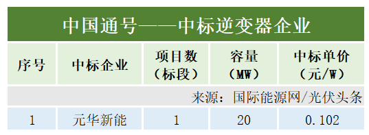 中国通号集团本统计周期有1个项目定标,定标容量20MW,河南元华新能源科技有限公司中标,中标单价为0.102元/W。