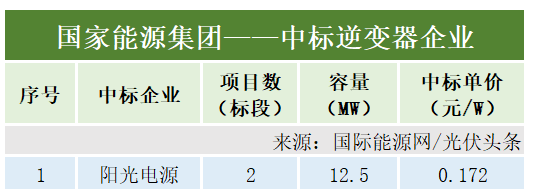 国家能源集团本统计周期有2个项目定标,阳光电源成为最大赢家,独揽12.5MW中标份额。