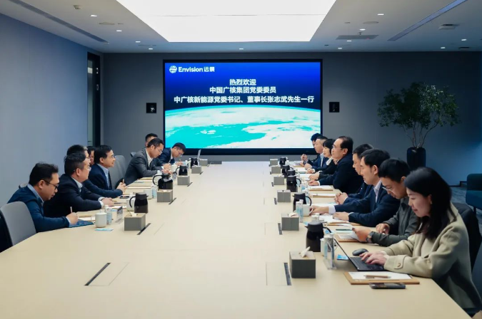 2月19日,中国广核集团有限公司党委委员,中国广核新能源控股有限公司党委书记、董事长张志武带队赴上海会见远景科技集团(简称“远景”)CEO张雷,双方围绕高质量协同、数字化运维、智慧风电与储能、零碳产业园等领域进行深入交流。