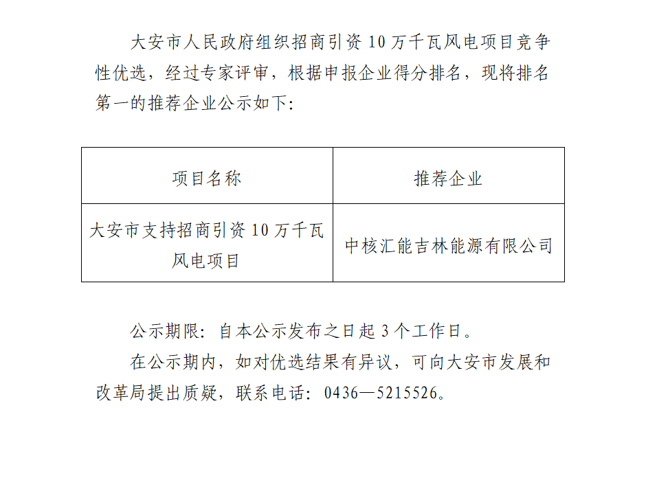 3月12日,吉林省大安市人民政府发布关于大安市10万千瓦风电项目建设指标竞争性配置优选结果。