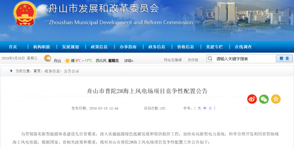 3月19日,浙江舟山市发展和改革委员会发布《舟山市普陀2#海上风电场项目竞争性配置公告》。