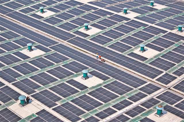 3月21日,巴南区重庆铃耀汽车有限公司屋顶光伏电站,随着天气逐渐晴好,光伏发电项目产能开始攀升,市南供电公司工作人员正在检查新投用的光伏设备,确保其正常运行。