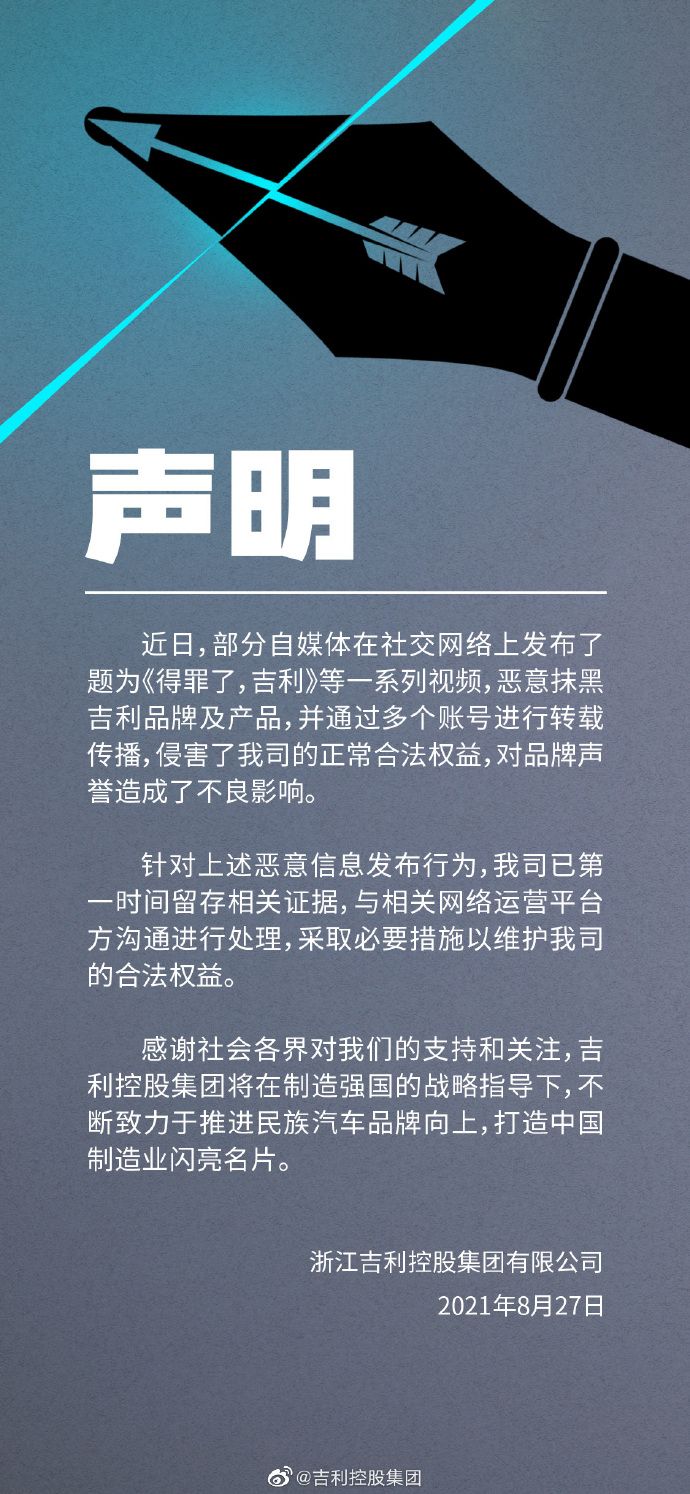 商业 吉利控股集团声明:《得罪了,吉利》等视频恶意抹黑吉利 2021-08-28 09:12:11 分享 来源:界面新闻8月27日晚间,@吉利控股集团微博发布声明称,近日,部分自媒体在社交网络上发布了题为《得罪了,吉利》等一系列视频,恶意抹黑吉利品牌及产品。针对上述恶意信息发布行为,我司已第一时间留存相关证据,与相关网络运营平台方沟通进行处理,采取必要措施以维护我司的合法权益。