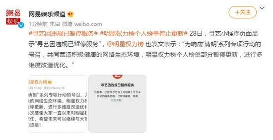 此外,以签到排名为主要内容的平台也陆续被监管关注。以“寻艺”App为例,28日中新经纬客户端下载该应用后发现,应用首页仍为各明星的排名榜单,分为签到榜、指数榜、带货排名等。同日,有网友发现寻艺小程序因违规已暂停服务。