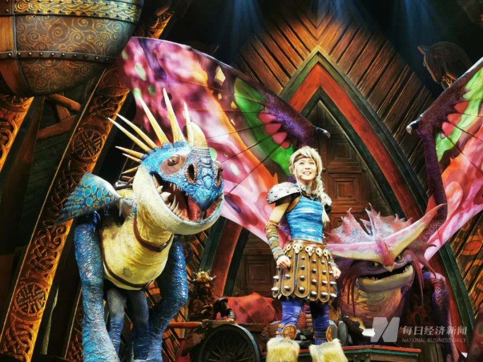 8月26日下午,在好莱坞主题公园剧院内,来源于电影《驯龙高手》的舞台剧“不可驯服”正在上演,一位来自北京市朝阳区的13岁男孩边看边给他的妈妈“科普”故事背景,干冰制造的氛围感、在观众座椅上空飞行的剧中角色,以及热情的演员,让游客沉浸在剧情中。